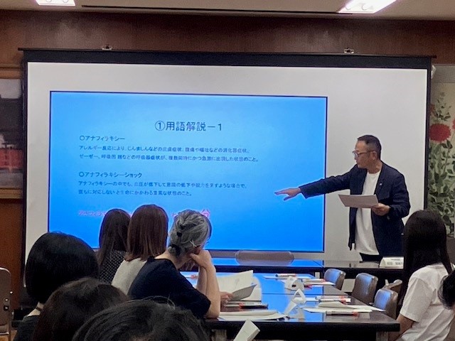講義を聞いた後、実際に練習用のエピペンを打つ練習もしました。