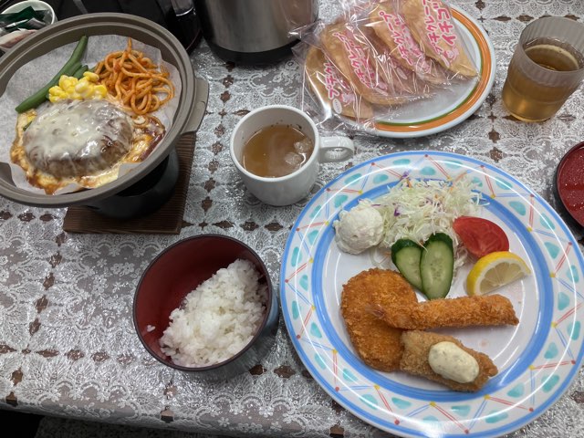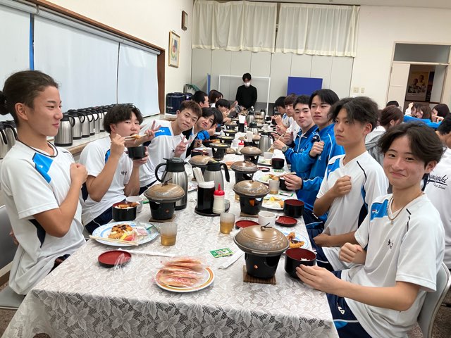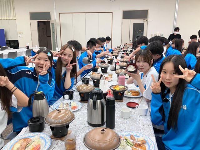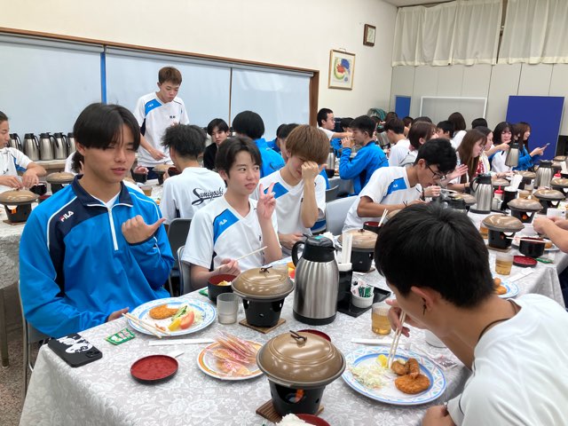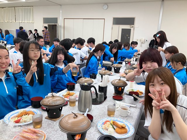 1年生総合科学科の探究合宿第1日。フル稼働で活動した後の晩ご飯です。生徒たちは食欲旺盛です。