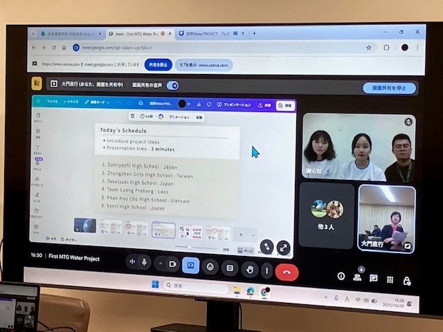 10月29日(水)午後より、オンラインによるInternational Water Project 2025 First meeting が行われました。6つの高校が「水質」に関する探究活動を互いに発表する取組みです。日本からは府立住吉高校、府立千里高校、私立高槻高校、海外からは台湾の中山(ちゅうざん)女子高級中学校、ベトナムのPhan Huy Chu高校、そしてラオスのLuan Praba10月29日(水)午後より、オンラインによるInternational Water Project 2025 First meeting が行われました。6つの高校が「水質」に関する探究活動を互いに発表する取組みです。日本からは府立住吉高校、府立千里高校、私立高槻高校、海外からは台湾の中山(ちゅうざん)女子高級中学校、ベトナムのPhan Huy Chu(ファン・フイ・チュー)高校、そしてラオスのLuang Prabang(ルアンパバーン)の高校です。今日は第1回ということで、それぞれの研究テーマの紹介をしました。ファシリテーターは本校教員です。