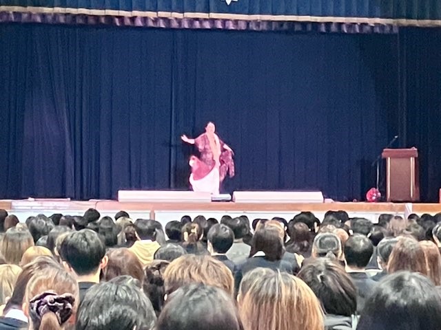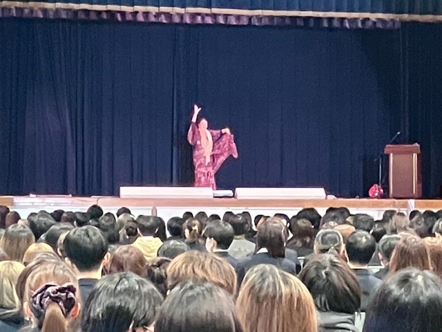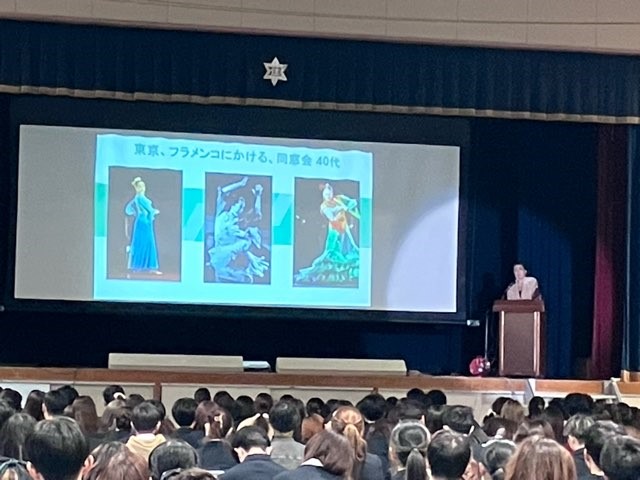 続いて34期生の林結花さんです。卒業後、イギリス在住時代にスペインを訪れ、アンダルシアの文化、特にカンテフラメンコに強く惹かれ、踊りを習い始められました。その後スペインに長期留学され、ダンスを習得。現在はスイスにお住まいで、フラメンコの公演だけでなく指導もなさっています。今回、ご家族と共にスイスからお越しくださいました。林さんは高校時代の苦手科目の克服の話や失敗談、そしてフラメンコへの情熱についてお話してくださいました。そして、実際フラメンコも踊ってくださいました。
