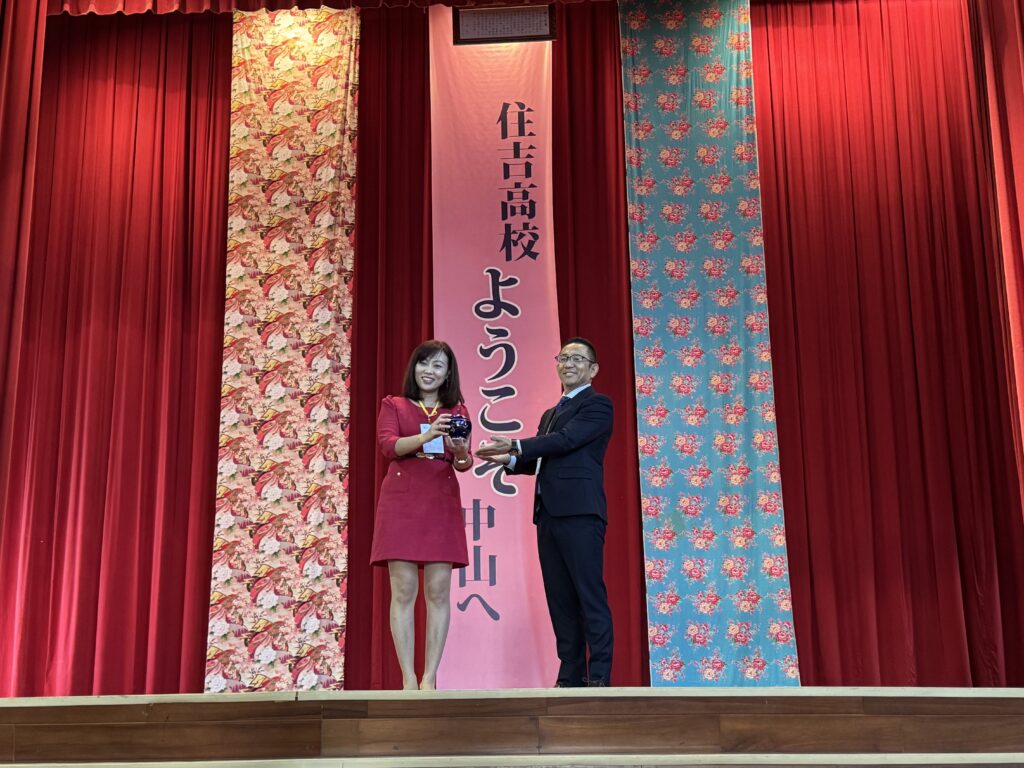 スタディーツアー3日めは姉妹校の中山女子高級中学との交流です。歓迎のダンスが披露され、現地の校長と本校教頭の挨拶の後、記念品の交換が行われました。