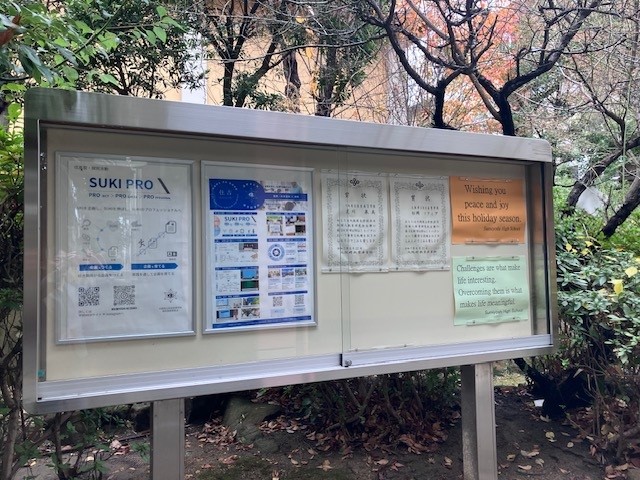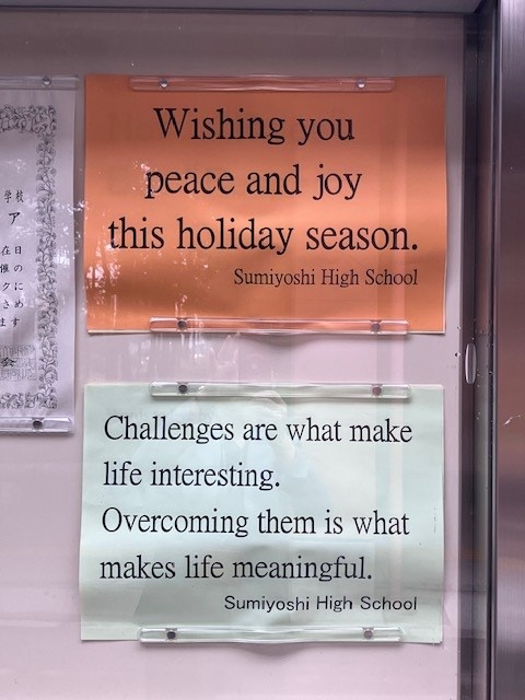 玄関近くの掲示板を年末バージョンにしました。生徒の皆さん、気づいてくれたでしょうか。下の文の意味が分かるかな。