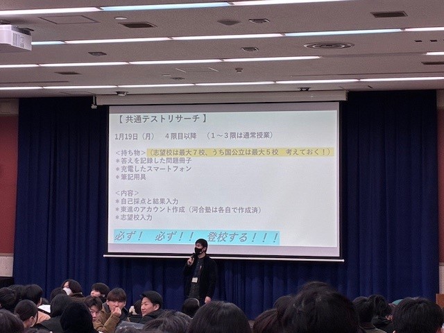 1月16日(金)、寒さが和らぎました。明日、明後日の共通テストへの諸注意と激励のため、共通テスト壮行会を行いました。200名を超える生徒が視聴覚教室に集合しました。