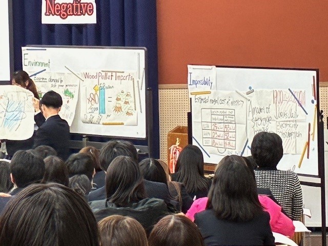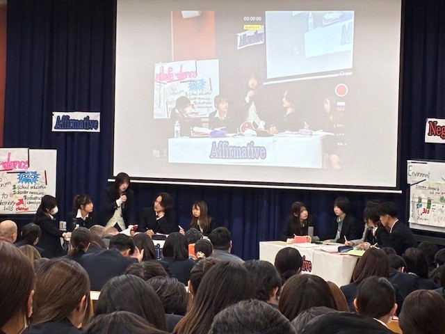 2月5日(木)5,6限で2年生国際文化科の[Debate Discussion]の授業の集大成であるDebate Tournament のFinal が視聴覚教室で行われました。タイトルは「日本は2050年までに再生可能エネルギーに100%移行すべきだ」です。Affirmative (賛成)とNegative(反対)に分かれてルールに従って討論します。