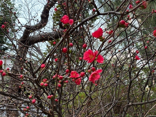 2月24日(火)、校庭の奥の方に紅梅がきれいに咲いていました。