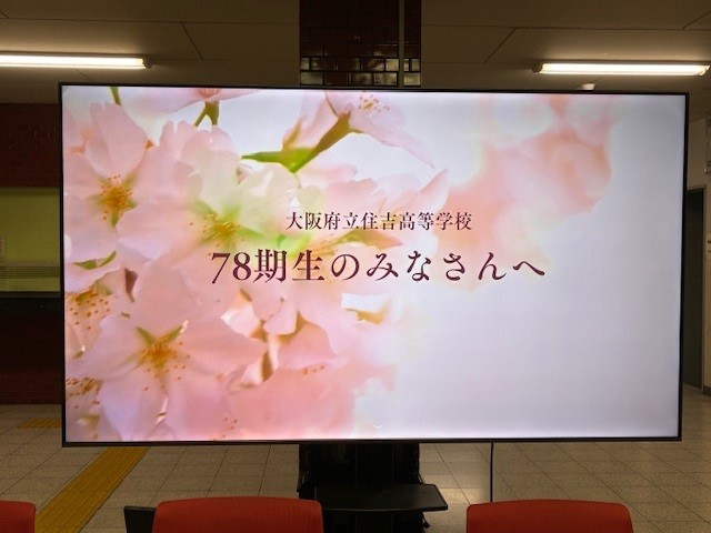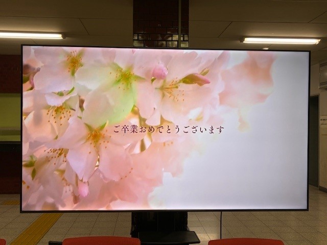 2月27日(金)、心配していた雨も降らず、暖かい日でした。本日、第78回卒業証書授与式を行いました。玄関に100インチのモニターで担任団からのメッセージを映しました。