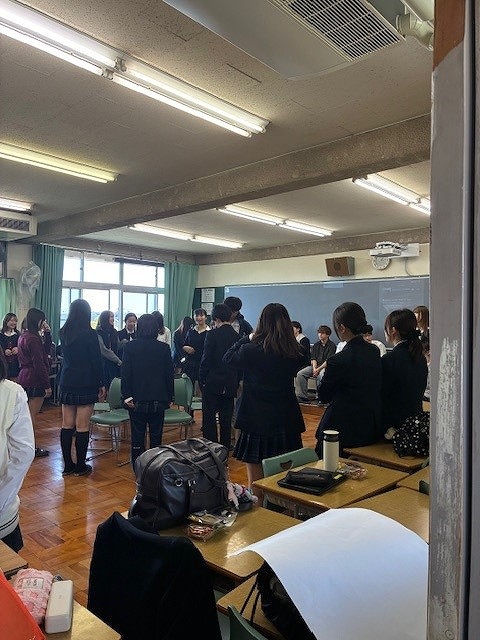9時ごろ到着し、2,3,4限と生徒と一緒に授業を受け、午後からは1,2年の教室に分かれて歓迎会をしました。