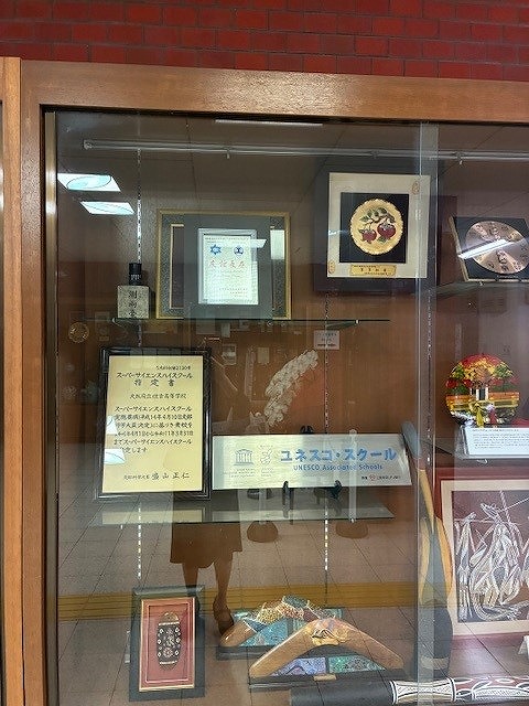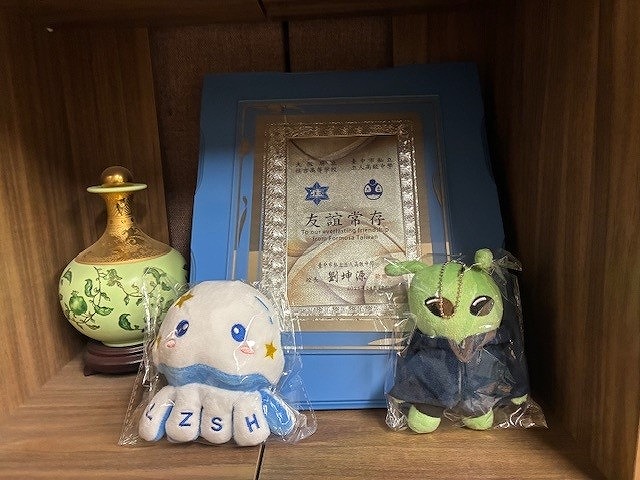 このマスコットは生徒さんがデザインを考え、優秀作品に選ばれたものです。後ろの盾は3年前来校された時のものです。