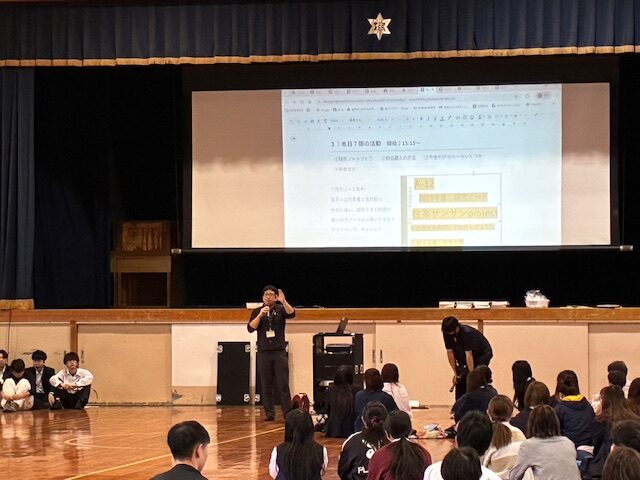 体育館で説明を聞いた後、担当教員からの助言をもらいます。大切なことは、先生に頼らず、自分で探究したいことをグループで検討し、、自主的に動くことです。6月の探究カフェ、9月と2月の探究フェスティバルを楽しみにしています。